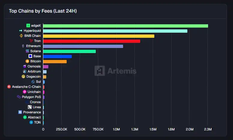 根据 Artemis 的"Top Chains by Fees"数据,edgeX 以 230 万美元的 24 小时手续费收入超越 Hyperliquid,成为新的链上手续费**,凸显了平台的高交易活跃度和用户粘性。