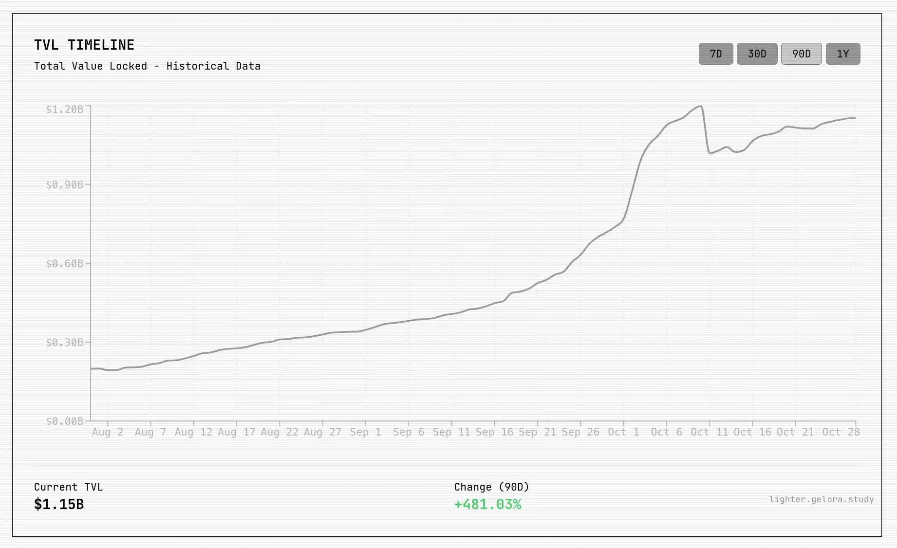 据社区制作的仪表盘网站和ighterlytics数据显示了 lighter 的数据增长,lighter 目前的 TVL 为 1.15B,过去三个月增长率为 481%。