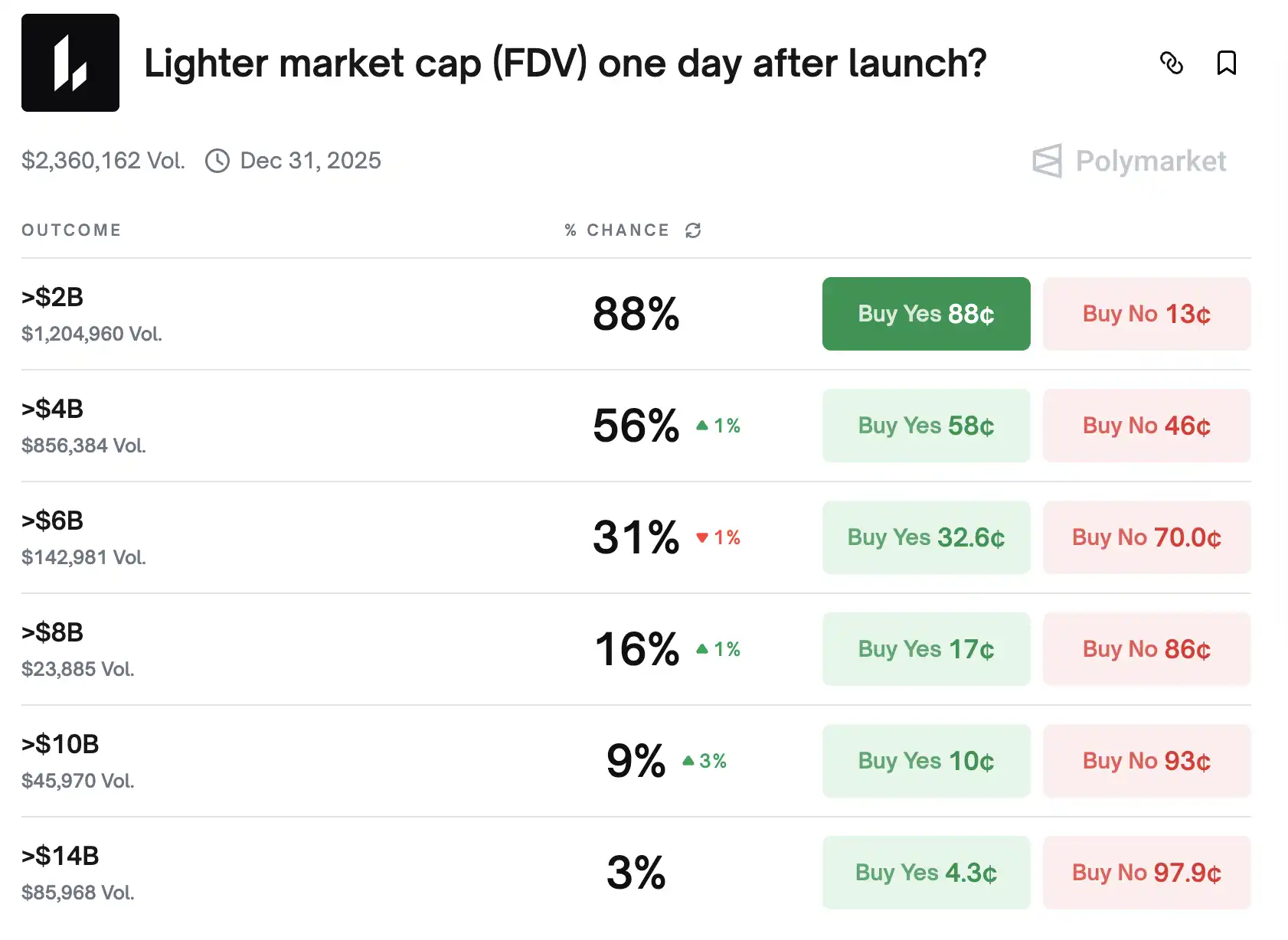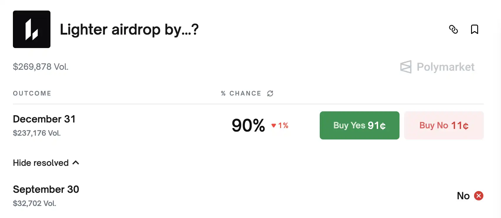 Polymarket 的数据进一步印证了这一预期,显示 Lighter 在 12 月 31 日前完成空投的概率高达 90%。这意味着参与者可能在年底前就能收到期待已久的**奖励。