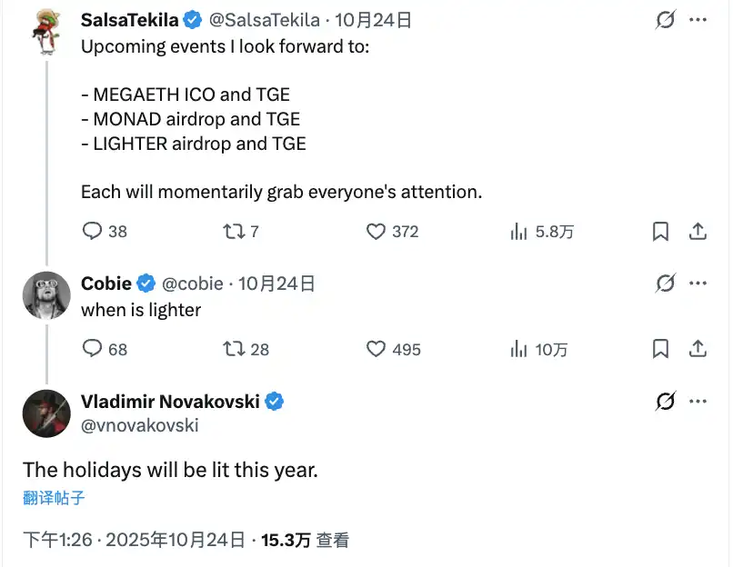 Lighter CEO 在推特上的**暗示让社区对空投时间有了更明确的预期。他明确表示第二季积分计划将在年底前结束,但不是 12 月 31 日,并发推称"今年的假期将会很精彩"(the holidays will be lit this year)。