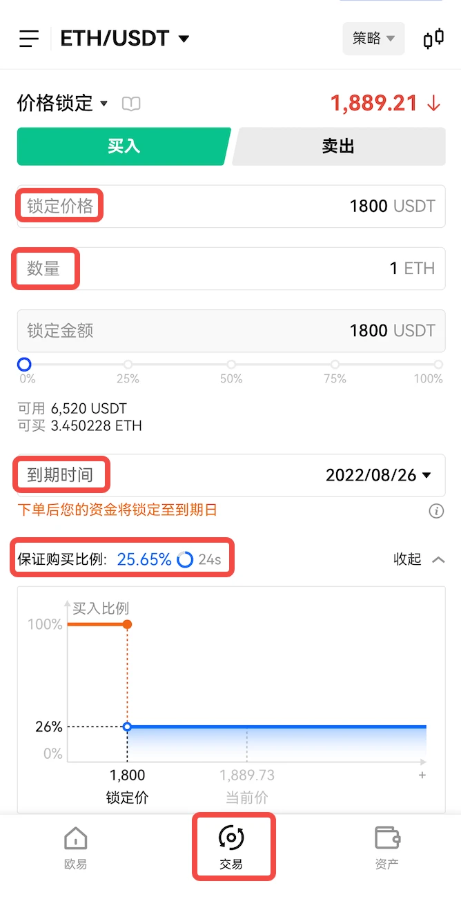 如下图中ETH/USDT买入为例,使用【价格锁定】时,填入锁定价格1800、数量1个ETH、到期时间2022/08/26,输入这些参数后,在这30秒的倒计时里,系统会自动计算出【保证购买比例】,如本次保证购买比例是25.65%,即到8月26号16点交割时间后,当价格高于1800时,也能买到25.65%*1=0.2565个ETH;如果价格小于等于1800,则能按照1800**成交。