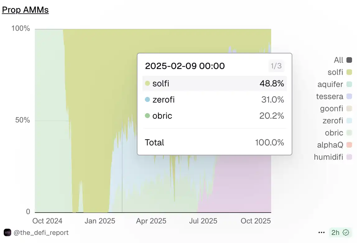 HumidiFi 于 2025 年 6 月中旬正式上线,仅仅两个月后,就已经占据了所有自营 AMM 交易量的 47.1%,成为无可争议的市场领导者。相比之下,曾经的霸主 SolFi 的市场份额从两个月前的 61.8% 急剧下滑至 9.2%。