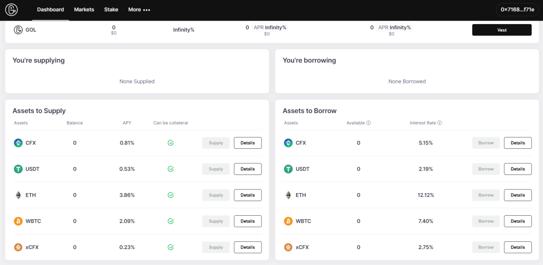 Goledo 是一个 Fork Aave 的借贷协议。平台收入来自于借贷利息差和闪电贷费用,其中收入的 50% 分配给 GOL 质押者和锁仓用户,另一半则流入 Goledo 国库。此外,与无锁仓期的质押不同,对于锁仓 GOL 的用户将会有三个月的锁仓期,除了也可以享受平台收入外,如果提前取出,则会面临 50% 的罚款,罚款将分配给其他 GOL 锁仓用户。