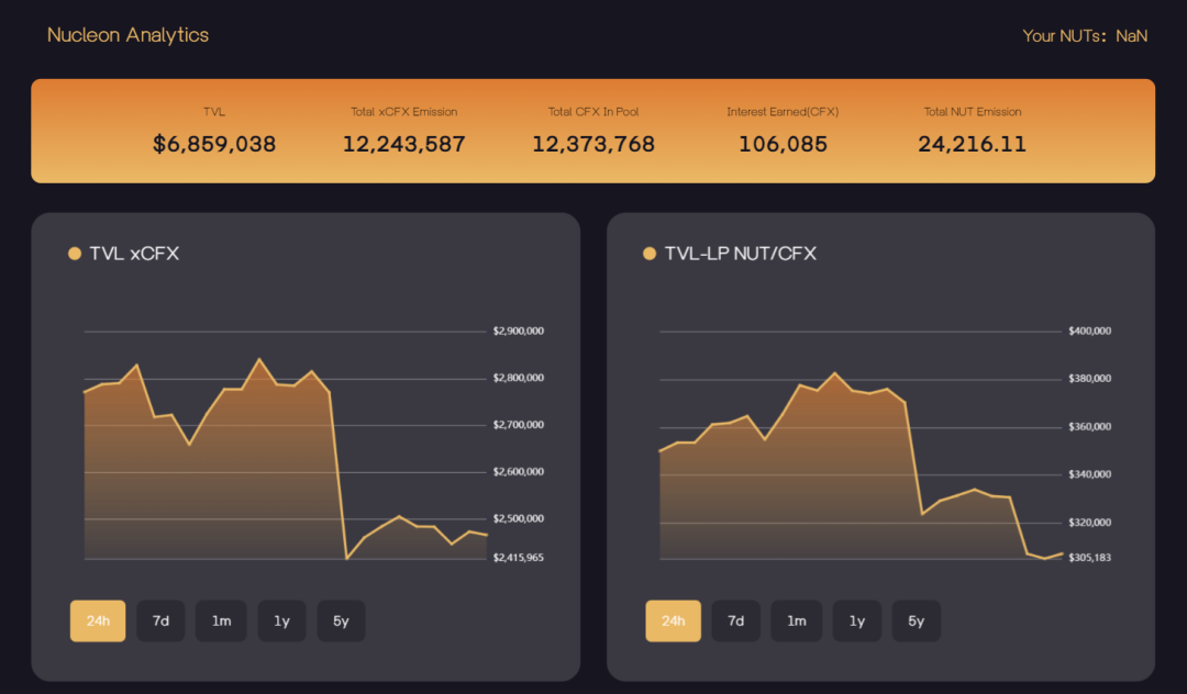 Nucleon 是 Conflux PoS 的流动性质押解决方案,允许用户在无需锁定资产或维护基础设施条件下质押 CFX。当用户使用该平台进行质押时,会收到 1:1 比例的 xCFX(代表其所质押的 CFX)。xCFX 可以帮助用户赚取收益和**奖励,并会每天更新余额以反映 CFX 质押奖励。Nucleon 对质押用户收取质押收益中的 10% 作为服务费。Nucleon 已推出 NUT,持有者可以对使用国库资金的提案进行投票。当前 Nucleon 上共质押了超过 1200 万枚 CFX,价值超过 680 万美元,APY 约 18.7%。