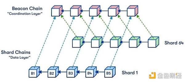 分片实质上是将以太坊的整个网络分割成更小的片,称为「分片」,以努力提高网络的可扩展性。与将所有操作集中在单个区块链上不同,分片链将这些操作横向分布在 64 个新的 / 迷你区块链上。通过划分负载,每个验证者将不再需要处理整个网络上的所有交易。与现有的工作证明模型相比,这既可以减少网络拥塞,又可以增加网络上每秒的交易量。
