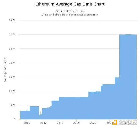 以太坊平均 gas 限制图表显示了以太坊网络的历史每日平均 gas 限制(2016 年至今)。与**区块大小为 1 MB 的比特币不同,以太坊在技术上没有**区块大小(矿工可以集体增加或减少以太坊的区块 gas 限制)。然而,限制每个区块消耗的 gas 有助于管理以太坊区块链的增长以及运营矿工或节点的成本。图片来源:Etherscan