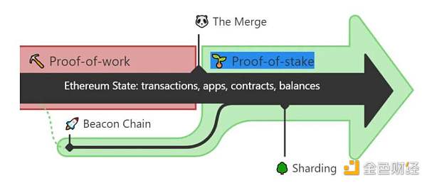 让我们打个比方。想象以太坊是一艘还没有准备好进行星际航行的飞船。有了信标链,社区就相当于建造了一个新的引擎和一个坚固的船体。经过重要的测试后,为飞行中的把旧引擎换成新引擎。这将把新的、更**的引擎与现有的飞船融合在一起,准备投入一些光年的时间,并占领整个宇宙。- Ethereum.org 对合并的类比,新引擎是信标链 ( 权益证明 ),旧引擎是工作证明,宇宙飞船是以太坊。
