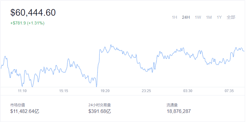 2021-11-18 Bitcoin(比特币)价格 当前价格 市场总值 24小时交易量 流通量 $60,444.60 $781.9 ( 1.31%) $11,482.64亿 $391.68亿 18,876,287