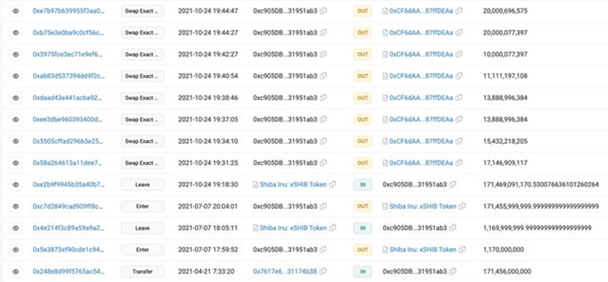 地址“0x7617”很早就开始交易SHIB,在2021年5月SHIB价格大幅上涨之前购买了约5万5千亿枚SHIB ,成本仅约为40万美元。 然后地址“0x7617”在2021年5月和2021年10月通过34个地址以超过3.5万美元的ETH价格出售了所有SHIB。