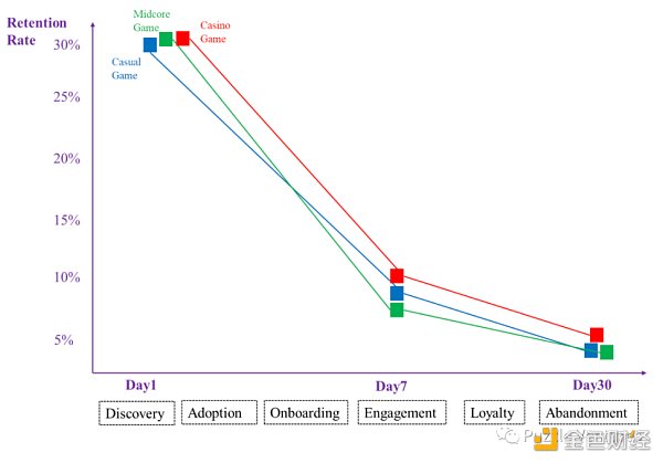用户生命周期用户生命周期是对休闲游戏的时间轴维度的评估指标。用户生命周期决定了一款休闲游戏在主要流量增长期间的用户价值。根据 liftoff 的数据统计,如图 4 所示,主流的 Web2 游戏类 app 基本上 1 日留存、7 日留存、30 日留存分别是 30%,10% 和 3% 左右,即使上瘾程度**的**类游戏也仅仅在 7 日留存和 30 日留存上达到 12% 和 5%。也就是说,实际上一款休闲游戏的一般用户生命周期就是 1 周到 5 周左右。