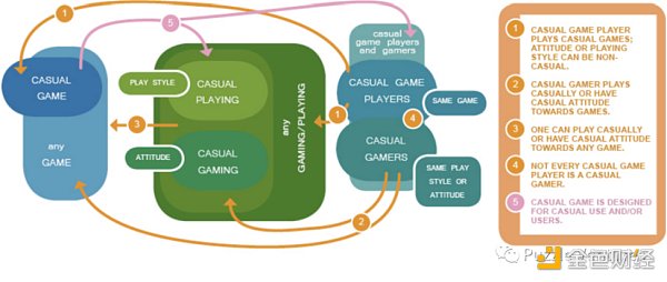 如图 1 所示,学术界也曾经对「休闲游戏」的定义进行讨论,认为休闲游戏不仅仅是从游戏本身的设计模式上属于简单玩法,也要从游戏玩家在玩游戏的态度上来定义。也就是说,当玩休闲游戏的玩家不是抱着休闲态度的游玩,而是抱着打金、冲榜等激进的态度游玩,那实际上他们的游玩行为已经不再是「休闲」状态了。换句话说,当一个休闲游戏的 play to earn 元素过重,或者排行榜机制给的奖励过高,会带来游戏性质的改变。