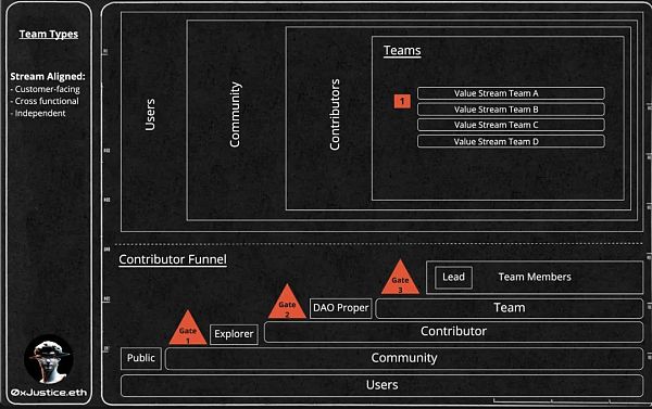 这些插图是基于我之前在《重新思考DAO贡献者漏斗》中详细阐述的工作。图的下半部分从侧面查看DAO,而上半部分从顶部查看DAO。