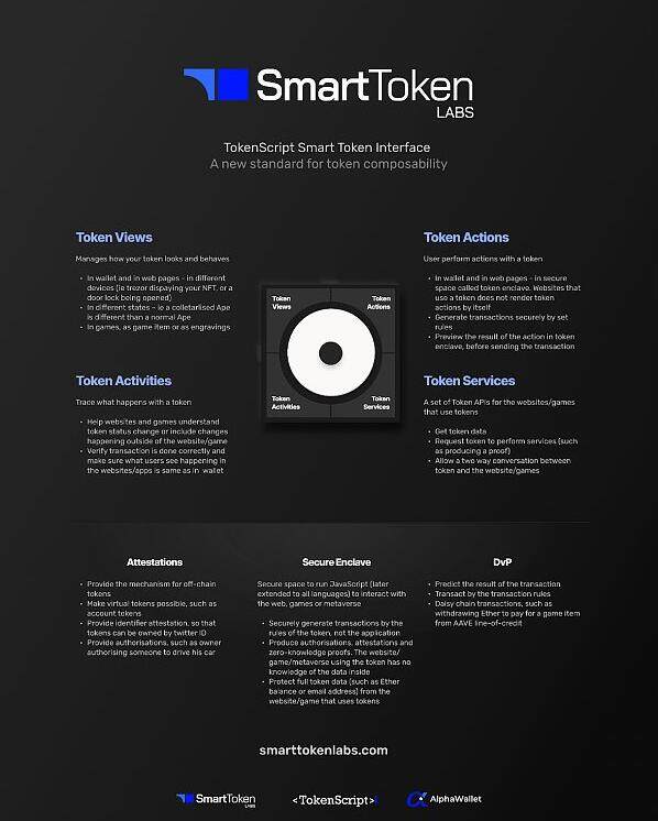 能达到这种集成,发挥这种市场力量的Token,需要是下一代的Token,我们称为Smart Token。它必须能在手机和网站上有独立的运行环境,而不能交代给集成它的应用去运行。它必须能直接从区块链获得真相,而不能依赖网站怎么说就怎么来。它必须是一种独立的,可以和其它服务接爻(Composible)的基本组件,同时具有集成和市场属性。因此我们是需要比NFT更为丰富更安全的技术框架的。这就是我们Smart Token Labs的核心能力。