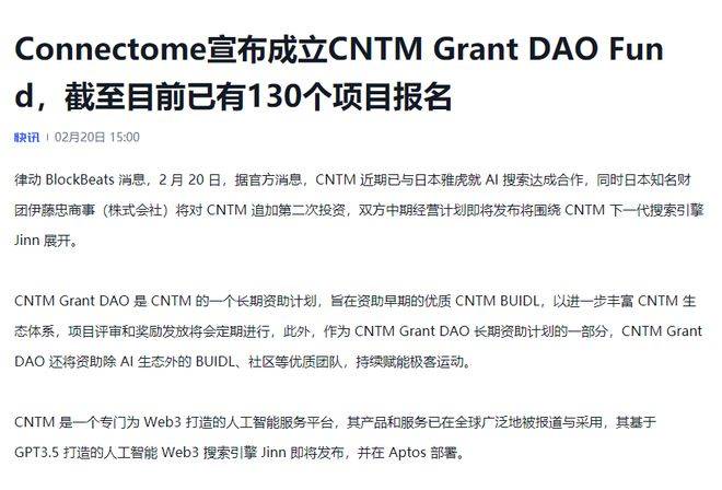 CNTM是一个专门为Web3打造的人工智能服务平台,其产品和服务已在全球广泛地被报道与采用,基于GPT3.5打造的人工智能Web3搜索引擎Jinn即将发布,并在Aptos部署,对AI板块感兴趣的可以长期持续的关注