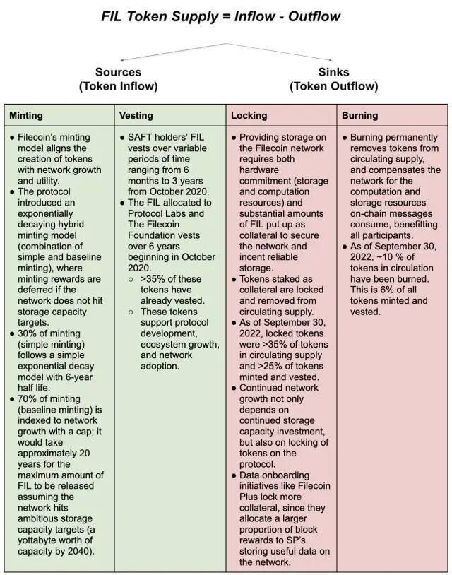 网络的增长需要使用和消耗**,从而减少了可用的**供应。截至2022年9月底,已铸造或授予约5.2亿FIL。其中,大约70%处于流通中,因为大量的FIL由于网络交易费用被烧毁(**从流通中移除),或被锁定为质押品以确保网络安全并激励可靠的存储。随着网络的成熟,**排放率(归属和铸造)预计会逐渐**,因为Filecoin具有有限的归属时间表和一个排放与网络增长挂钩的铸造模型。
