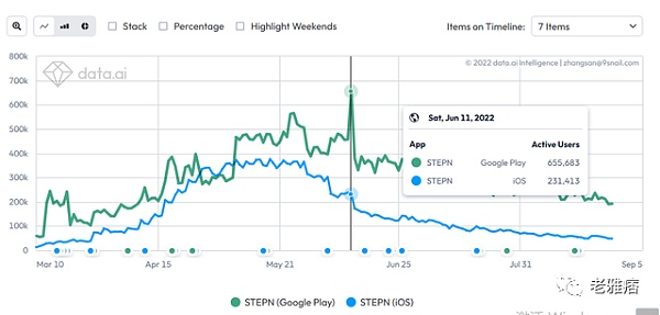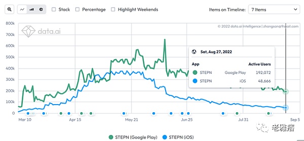 分析 StepN 的 App 日活跟链上日活,2022年6月初,App日活达到70万左右的峰值(来源Appannie),链上用户(包括NFT,GMT,GST活跃地址数)也达到每日12.7万左右的峰值。之后一路下跌,现在 App 日活有25万,跌了64%;但链上地址只剩7千日活,跌幅95%。