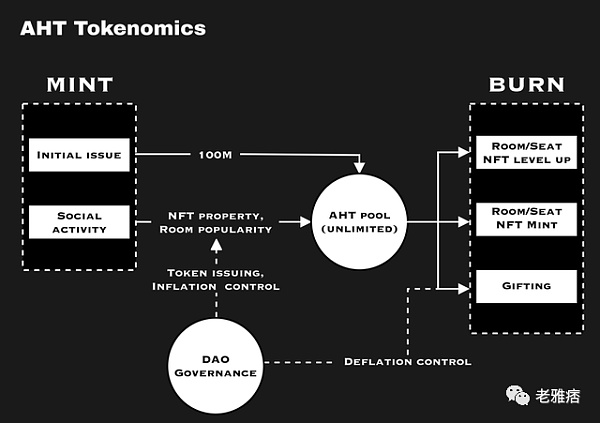 这样就形成了多种角色,嘉宾,主持人持有座椅NFT上麦交流赚AHT,同时必须相互送礼维持房间血条。有房主提供房间NFT,靠收送礼佣金赚AHT。
