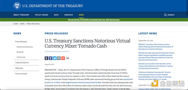 2022 年 8 月 8 日,美国财政部的 OFAC 的官网显示,将部分与 Tornado Cash 协议或与之相关的以太坊地址进行交互的地址,放入 SDN List 进行制裁,这是历史上**次链上智能合约被 OFAC 直接制裁。