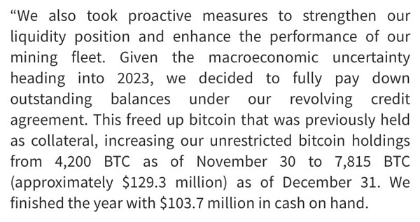 译文:“我们还采取了积极措施,以加强我们的流动性状况,提高我们矿业船队的表现。鉴于2023年宏观经济的不确定性,我们决定根据循环信贷协议全额偿还未偿还余额。这释放了以前作为抵押品持有的比特币,将我们不受限制的比特币持有量从 11 月 30 日的 4,200 BTC 增加到 12 月 31 日的 7815 BTC(约 1.293 亿新元)。