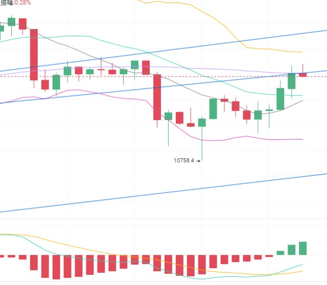 小时级别上,币价在触及下轨支撑后也有**程度的反弹,现在已经**中轨站在其上方;如附图所示,macd的死叉在不久前转为金叉,有继续延伸的迹象。不过kdj指标已经超买运行,短期上行空周期不算太大,大级别还是偏空的。日间短线操作建议以反弹做空为主。
