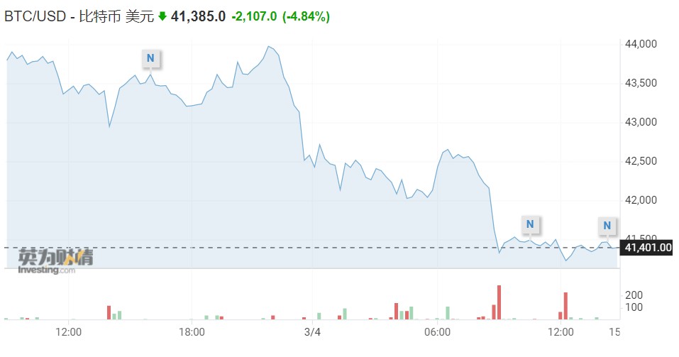 截至发稿,比特币跌4.84%,至41385美元。以太坊跌至2719.82美元,跌幅高达6.68%。另根据CoinGecko的数据,其他大多数**在过去24小时内也出现了下跌。