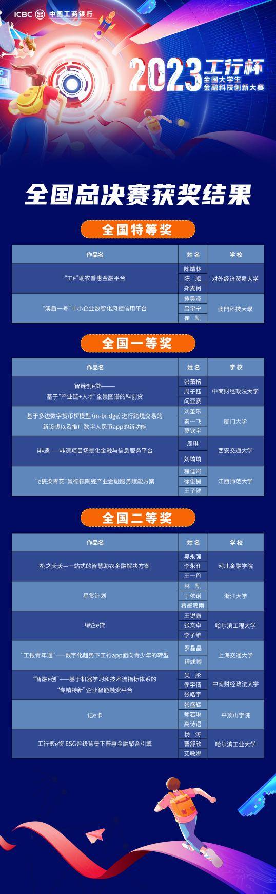 本届大赛契合**战略,以“数字工行更懂你——创新**未来”为主题,共吸引**6万余名学子报名,有效作品数达1.2万余份,大赛报名人数和作品数均创历史新高。历经作品征集、省赛、区域赛的激烈角逐,13组选手成功晋级**总决赛。**,《“工e”助农普惠金融平台》《“澳盾一号”中小企业数智化风控信用平台》两个作品脱颖而出,荣获**特等奖。