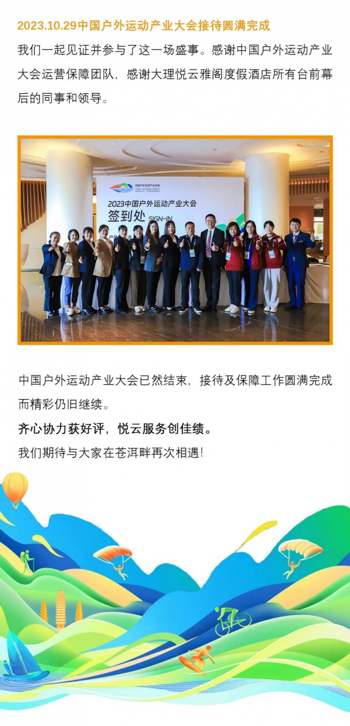 **户外运动产业大会已然结束,接待及保障工作圆满完成而精彩仍旧继续。齐心协力获好评,悦云服务创佳绩。大理悦云雅阁度假酒店(雅阁酒店集团旗下成员酒店)期待与大家在苍洱畔再次相遇!