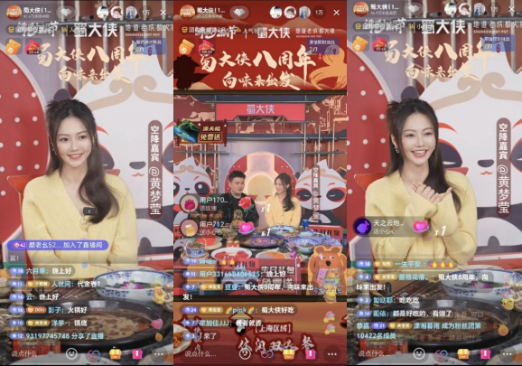 为了提升间的热度,蜀大侠邀请了热门影视剧“一念关山”中金媚娘的扮演者黄梦莹空降间,有效拉动了间热度,间**分钟场观15000 。此外,蜀大侠还紧抓当下热点,在间跳起了科目三,将间再次炒热,吸引了众多观众在评论区互动,有效聚拢了用户的注意力,并通过间福袋**等互动形式促进了下单率和转化率的提升。
