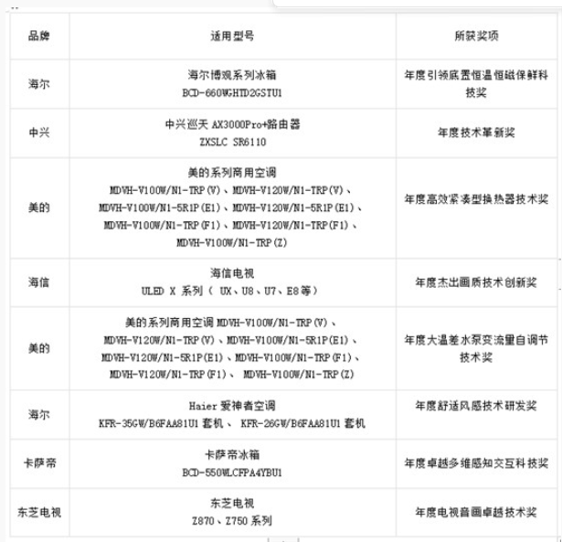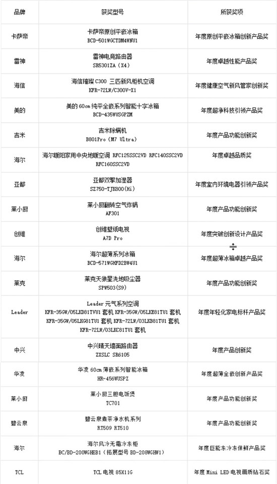 本次荣获“金选奖”的品牌主要有海尔、中兴、美的、海信、卡萨帝、东芝、雷神、亚都、吉米、莱小厨、莱克、创维、Leader、华凌、TCL、碧云泉等,产品涵盖冰箱、电视、路由器、空调、**空调、净水机、洗碗机、洗地机、除螨仪、电饭煲、加湿器等品类。(具体产品型号见文末附表)。