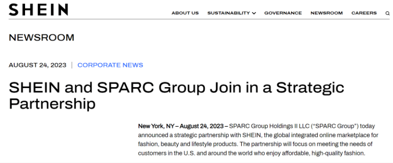 美东时间8月24日,美国快时尚品牌Forever 21的母公司SPARC Group Holdings II LLC (“SPARC集团”)宣布与**跨境电商巨头SHEIN达成战略合作伙伴关系,后者将收购前者约1/3股份,前者也将持有少量SHEIN股份。