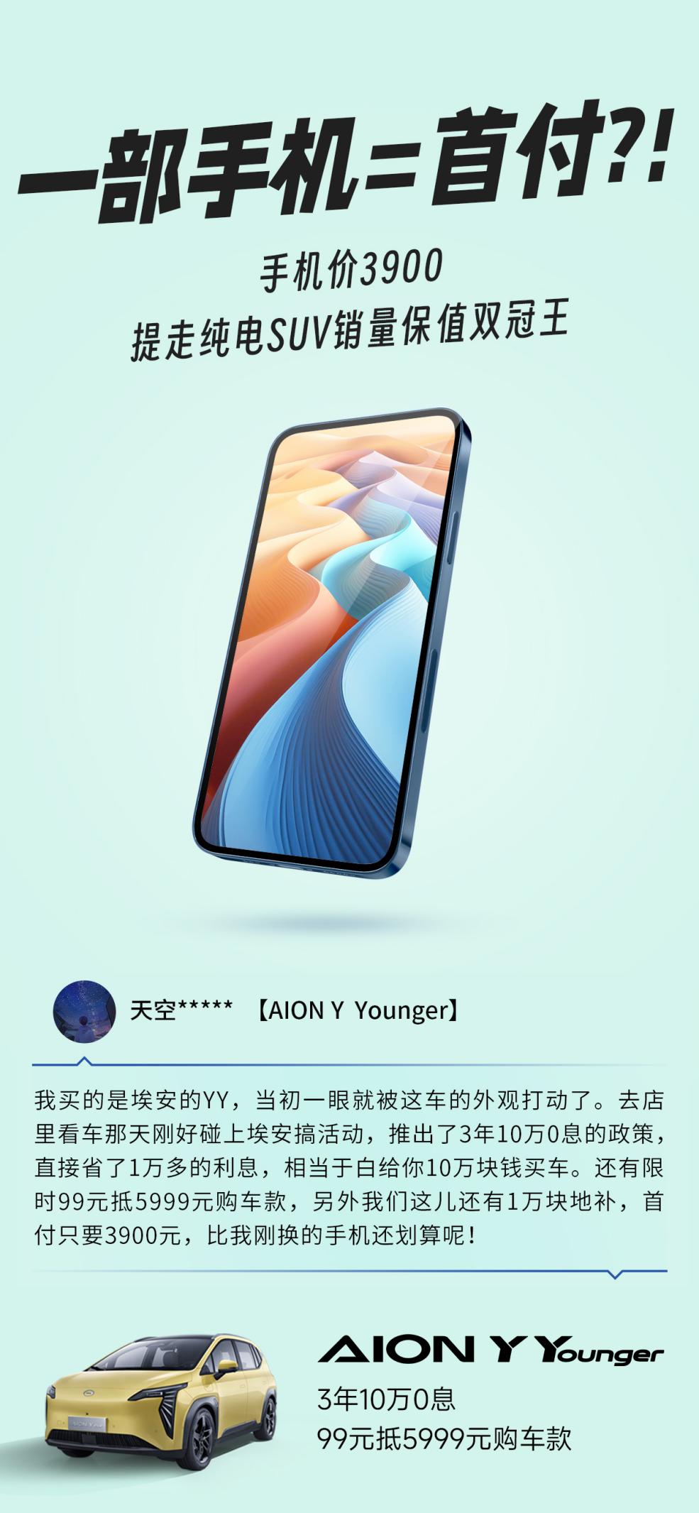 因为这次买车,主打还是一个尝鲜,所以预算也没有拉到特别高,大概10万左右就差不多了。所以销售一开始就给我推荐了AION Y Younger。