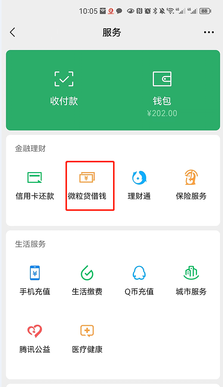 我是在微信【服务】找到“微粒贷借钱”入口的,(在手机QQ【我的QQ钱包】中