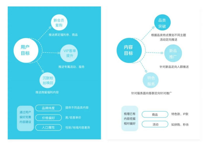 当完成公众号与CRM体系打通之后,运营者通常会提出几个疑问:我能否定义目标并提取目标粉丝数据?目前的内容是否能满足需求?有差异化内容可以提供给目标用户吗?通过用户目标和内容目标来完成公众号的精细化运营规划。