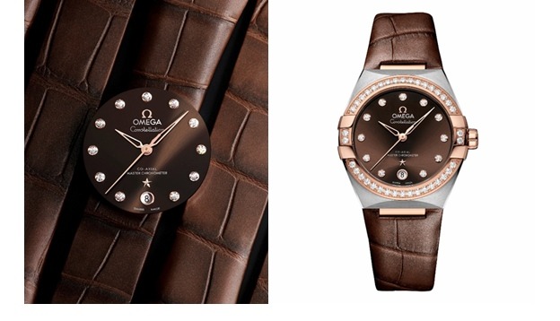 星座系列36毫米**天文台表 ,采用 Sedna 18K金打造,抛光表圈镶嵌38颗钻石,棕色表盘经过PVD涂层处理,呈现出太阳射线的打磨效果,指针、欧米茄品牌标识、星徽标志以及小时刻度均以 Sedna 18K金打造。搭配与表盘颜色相同的棕色皮表带,文质彬彬,是男女皆宜的手表。