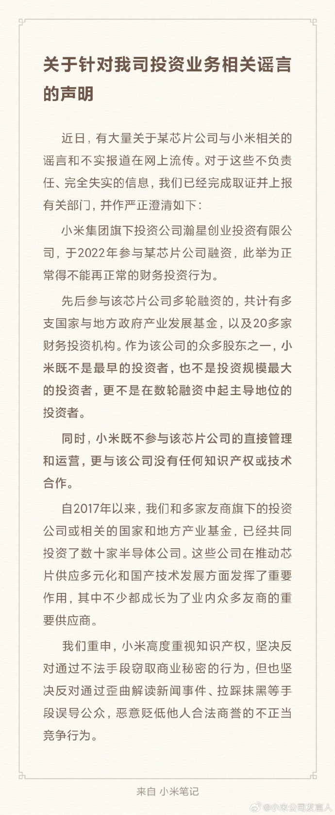 小米集团澄清关于与某芯片公司的传言 作者:网络 •更新时间:2023-12-25 00:08:43•阅读 0据小米公司发言人微博,近日,有大量关于某芯片公司与小米相关的谣言和不实报道在网**传。对于这些不负责任、**失实的信息,我们已经完成取证并上报有关部门,并作严正澄清。
