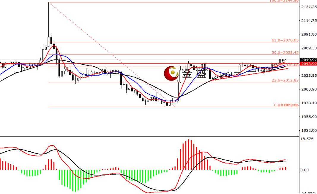 前一个交易日,美国三季度GDP和PCE指数意外下修,美指跳水失守102关口,黄金依托三角形下轨震荡上行,价格重回前高一带,当日波动逾十美金,**收涨0.73%。今天白盘行情延续涨势,多头尝试突破多日盘整区间,价格站上2050美元关口。四小时周期,均线系统收敛向上拐头,运行在价格下方构成支撑。MACD指标快慢线零轴上方现金叉,做多的动能为主。黄金多周期均是上涨格局,今天早盘快速拉升后以横盘整理为主,K线未出现明显承压迹象,价格偏向还将走高,后市关注2070美元一带的压力,操作上回调做多为主。