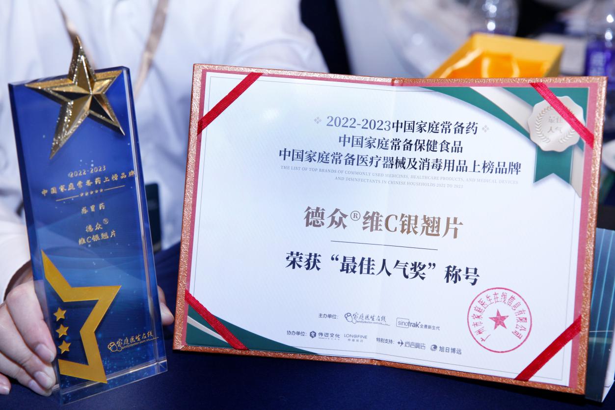 德众维C银翘片:荣获中国家庭感冒常备药“最佳人气奖”