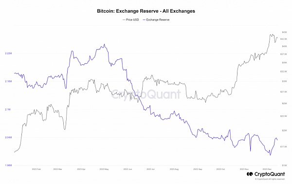 首先,从最直观的卖压来看,自 6 月以来,BTC 在交易平台的余额一直持续下降,但在 12 月 5 日至 12 月 12 日有明显的反弹迹象。在此峰值之后,BTC 价格一度从跌至 4.1 万美元。
