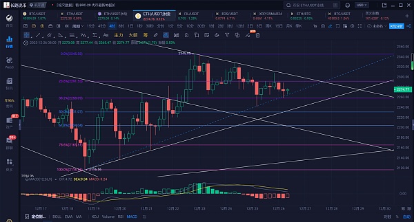 以太坊上个交易日整体行情处于窄幅震荡中,早间回踩2240附近低点反弹2308一线后,凌晨再次回踩2260,现行情位于2270附近震荡。