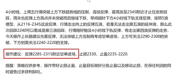 昨天长路在文中和视频中都给出了先看反弹,可以在2285-2315之间进场空单的策略,结合实时策略给出的多空震荡操作策略,跟上操作的朋友,多空都能拿下收获。