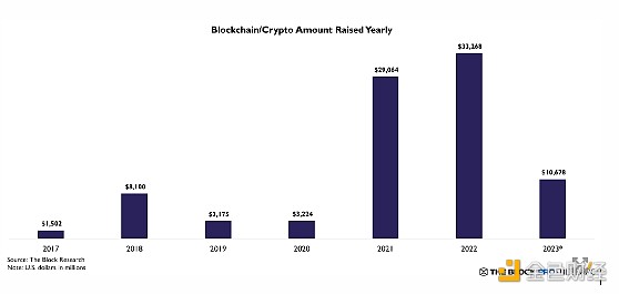 2023 年,风险投资家向加密货币和区块链初创公司注入了 107 亿美元,比 2022 年投资的 333 亿美元减少了 68%。