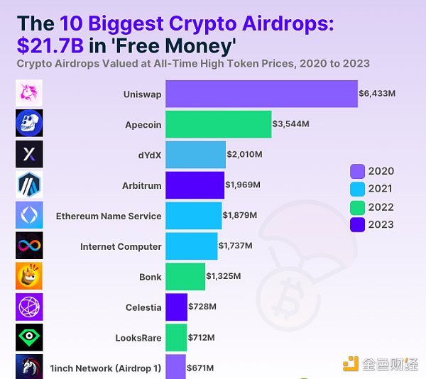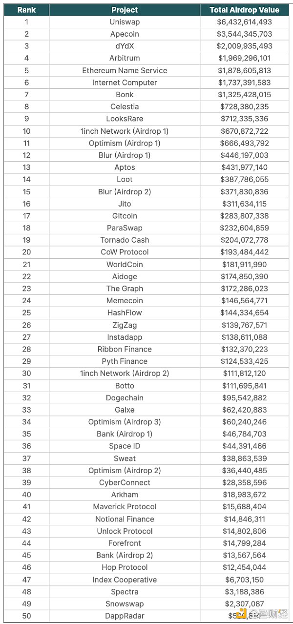 2023 年进行的空投中,有 13 次进入前 50 名。2023年分发了按 ATH 价格算价值 45.6 亿美元的**。