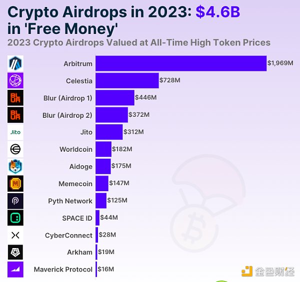 Arbitrum、Celestia 和 Blur 的**空投合计占 2023 年分发的加密货币空投总额(45.6 亿美元)的 69.9%。2023 年剩余的**加密货币空投价值从 1600 万美元到 3.72 亿美元不等。