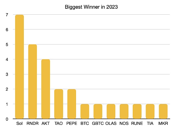最有意思的莫过于 Messari 公开的分析师持仓。下图为 2023 年 Messari 分析师**涨幅的持仓币种分布图。可以看到,分析师们的主要盈利来自于 Solana 生态以及 AI DePIN 概念。这也反映了分析师们很好地抓住了本轮上涨行情的头部叙事。