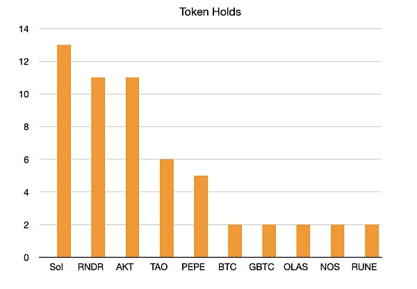 下图为 Messari 分析师目前的持仓**分布图(已去除出现次数仅 1 次的币种)。分析师们的主要持仓币种和 2023 年涨幅**的持仓币种类似,仍然集中分布在 Solana 与 AI DePIN 概念中。有意思的是,对于分析师们强烈看好的其他赛道,例如 DeSoc、DeSci、Perps 等,分析师们并未持有**相关的**。