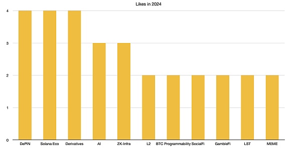 下图为 Messari 分析师喜欢的赛道(已去除出现次数仅 1 次的赛道)。和此前的情况类似,依然是 Solana 与 DePIN 概念占据主导。但是去**化衍生品超越了 AI 成为了分析师们最喜爱的赛道之一,ZK 概念也也来到了与 AI 平起平坐的重要**。