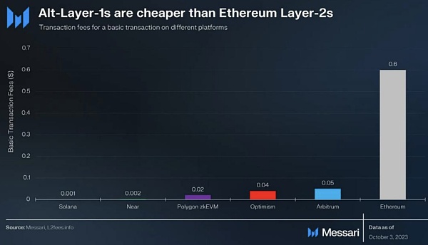 ETH 目前处于两难的境地。对机构的吸引力不如 BTC 数字黄金的叙事,其他的 L0、L1、L2 竞品也在逐渐蚕食以太坊上的交易量。尽管目前来看,ETH 的投资性价比较低,但 ETH 的坎昆升级仍然值得关注。以太坊的坎昆升级能够** 90%-99% 的 Rollup 的交易成本,使得 Rollup 与其他 Alt L1s 一样便宜。坎昆升级的交付日是最值得关注的日期之一。
