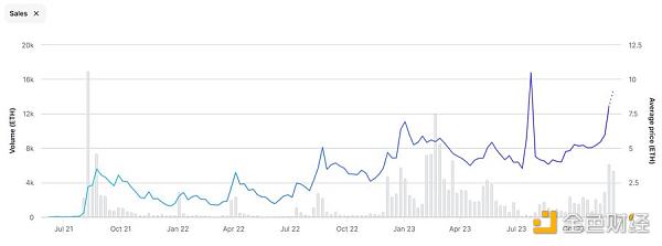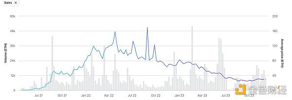 传统的PFP的故事已经很难让大家买单了。下图是BAYC的最近一两年的价格走向。在2022年Yugalabs还推出了APE 猴地的组合拳,让市场fomo一时。但是今年的NFT市场非常冷清,大户已经很难再来为NFT支付几万几十万美金。此外Azuki也让市场再寒心一波,今年推出的AZuki Elemental等也相当于直接复制粘贴一键生成就开始印钱,很难感受到团队的走心。