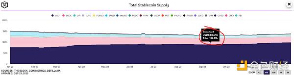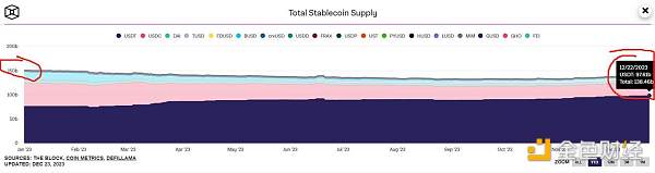 23年年初稳定币市值1500亿美金,23年9月是稳定币近一两年最少的时候,市值1324亿美金,市场流出了近180亿美金。但是BTC从17000美金涨到了26000美金,这意味着主流资金撤退,市场上的流动性从山寨土狗吸血到了比特币。但是在今年9-12月,稳定币在3个月只流入了40亿美金,BTC就从26000涨到了44000。