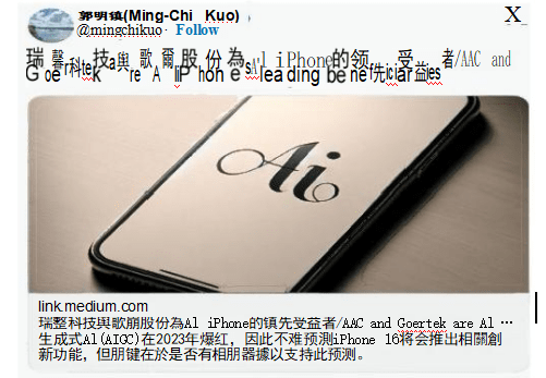 知名果链分析师郭明淇同日也公开称,鉴于生成式人工智能在2023年爆红的势头, 不难预测苹果公司将会在iPhone 16 中推出相关的创新功能。郭明镇指出,苹果在今年第三季度改组了Siri 团队,此举的目标就是在于整合AIGC功能 和大语言模型。他补充称,语音输入将是AI 的关键接口,因此强化Siri 的软件 和硬件的功能和规格是推广AIGC的关键。也就是说,明年有望发布的 iPhone16可能成为苹果首款 AI 手机。